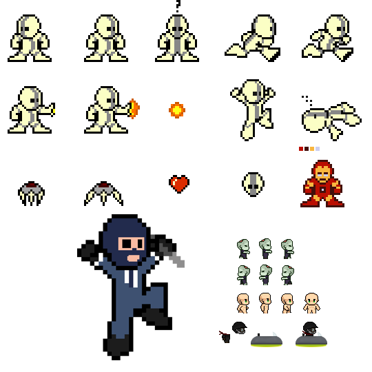 Inevitably, various friends have attempted to make 2D videogames. Here are some of the sprite sheets I've made, mixed together with the 8-Bit Spy I designed for my YouTube channel.